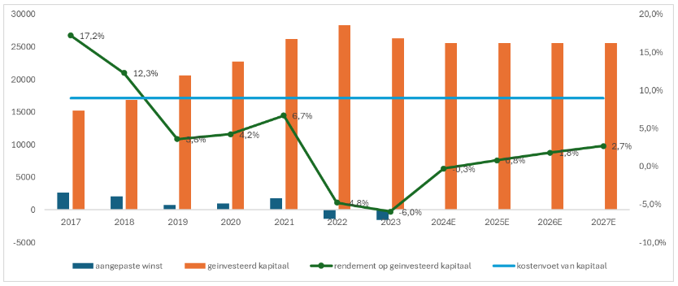Bron: jaarverslagen Shell. Bedragen in miljoenen dollars. Voor periode 2024-2027 is gerekend met analistentaxaties voor de aangepaste winst en het geïnvesteerd kapitaal is – in lijn met Shells strategie – gelijk gehouden aan het jaar 2023.