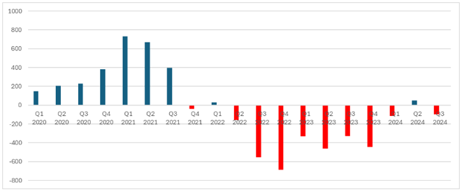 Shell wijt het verlies in het derde kwartaal aan “een lagere bezetting en lagere prijzen” in vergelijking met een kwartaal eerder. De bezetting daalde van 80 procent in Q2 tot 76 procent in Q3. Oorzaak: gepland en ongepland onderhoud.